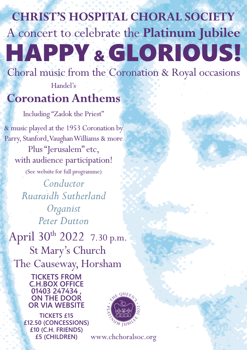April : "HAPPY & GLORIOUS!" A concert in honour of Her Majesty's Platinum Jubilee, including Parry "I Was Glad", Stanford's "Coronation Gloria" and Handel's Coronation Anthems "Zadok the Priest" and pieces by Vaughan Williams.
